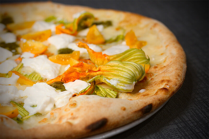 Mozzarella, Fiori Di Zucca, Datterini Gialli, Stracciatella, Gocce Di Pesto Genovese
