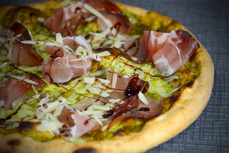 Bianca, Pesto, Gamberetti, Pomodorini, Mozzarella