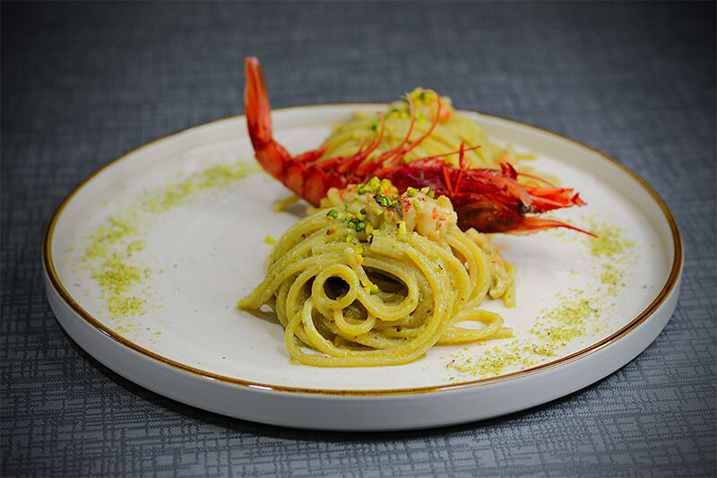 Ravioli ripieni ai funghi porcini, pesto di pistacchio, panna e granella di pistacchio